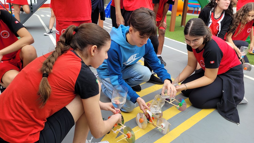 Nas últimas semanas, os estudantes do Math Club realizaram um projeto prático no qual utilizaram diversos materiais recicláveis, como garrafas pet, tampinhas e CDs para produção de carrinhos movidos a água. Após a produção dos carrinhos em sala de aula, os estudantes promoveram uma corrida no pátio da escola para definirem qual o carrinho com maior eficiência.